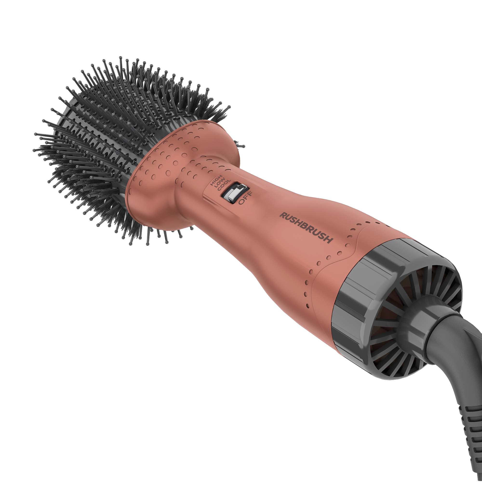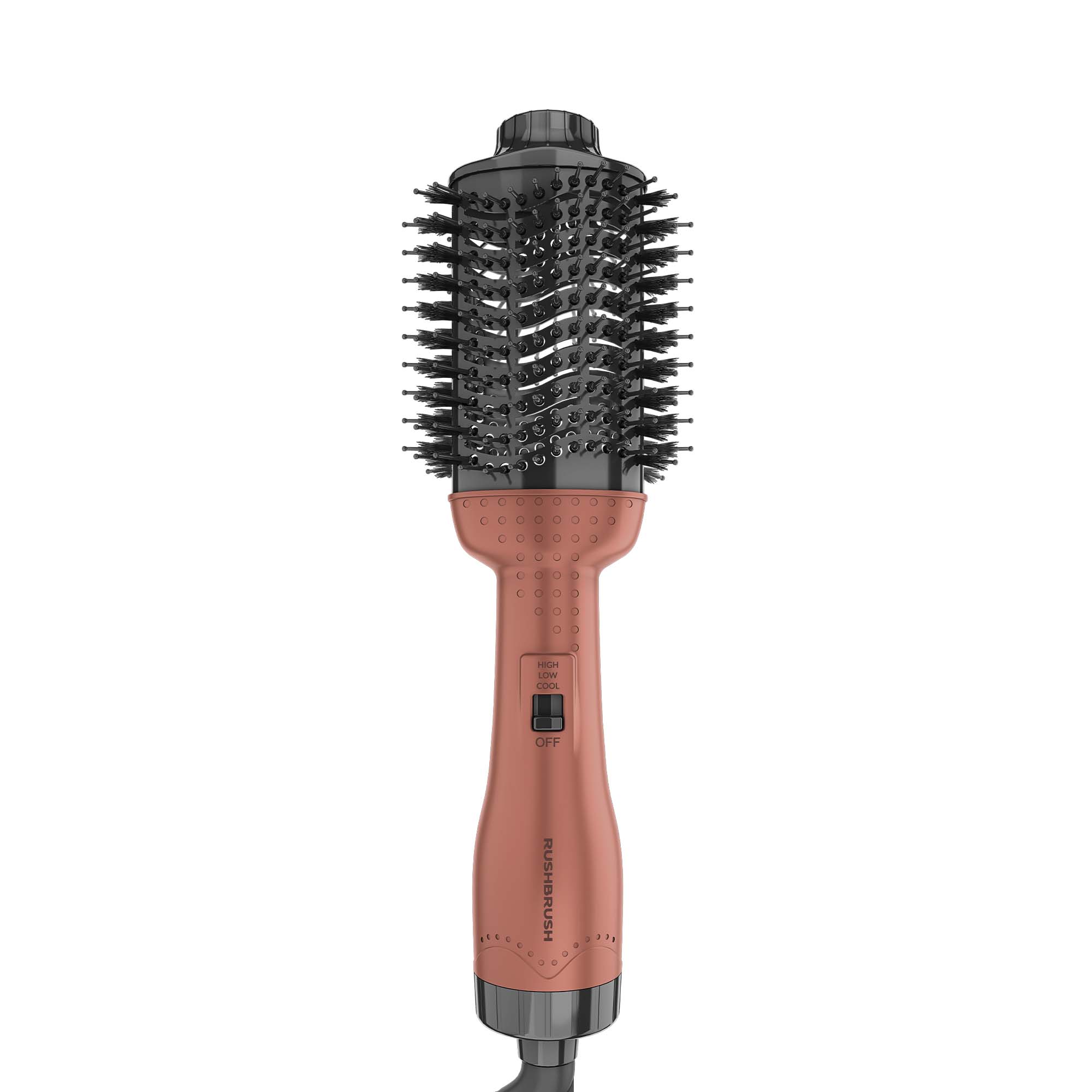 RUSHBRUSH® V2 PRO is designed to deliver gorgeous volume and brilliant shine in a single step. No more pointing a blow dryer down at a section of wrapped hair while maneuvering a round brush, this unique oval brush design smoothes the hair while the rounded edges quickly create volume at the roots and beautifully full-bodied bends at the ends in a single pass. It simply turns two jobs into one, just roll and scroll.